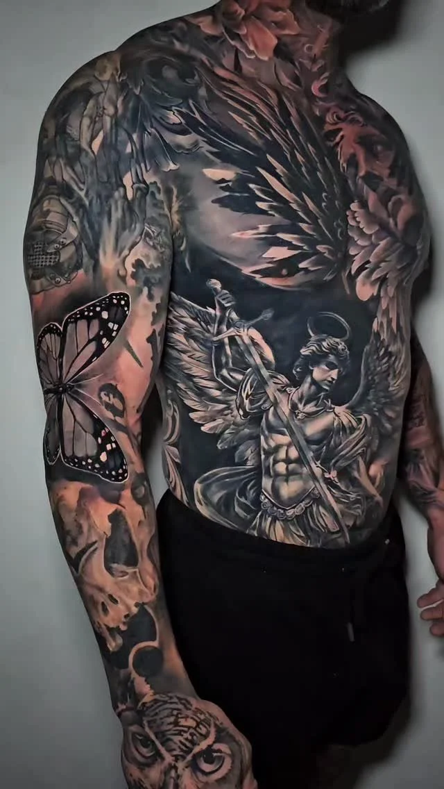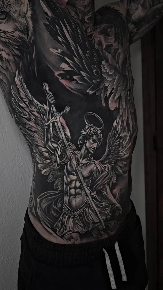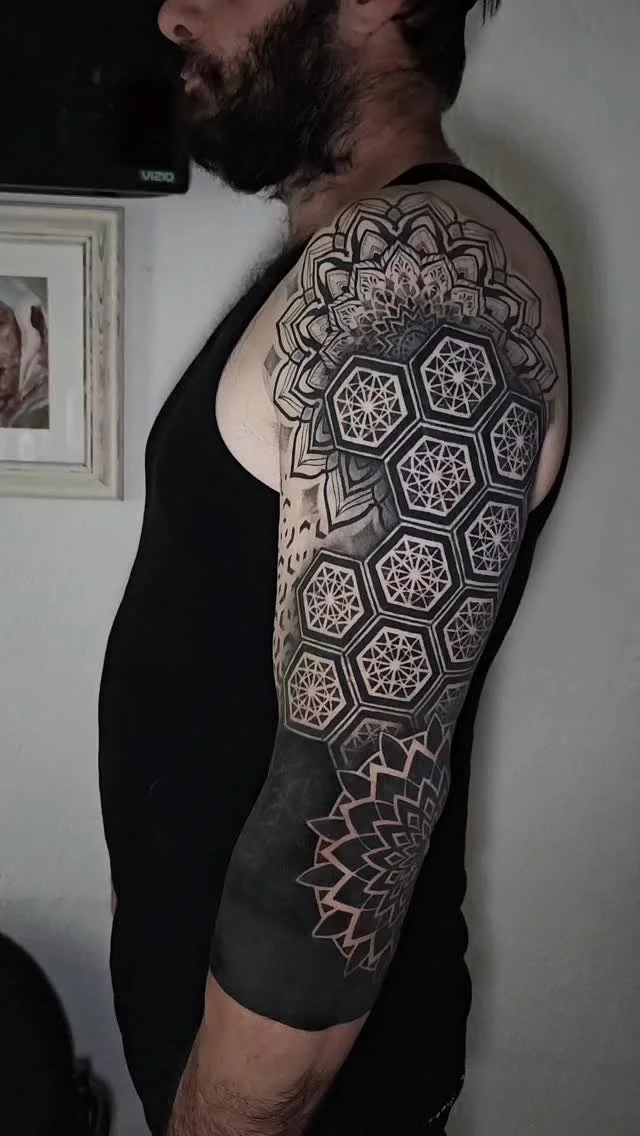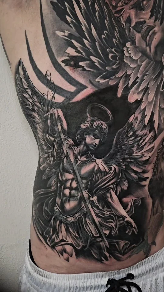 Britton is focused solely on black and grey, black work, and etching/woodcut with macabre or dark art themes, no color. He would love to do anything along the lines of bio mech, geometric/mandalas, floral/ornamental, black-out, blackletter/dark lettering and everything in between! If you have a smaller or simple design in mind he is happy to work with you on that as well.